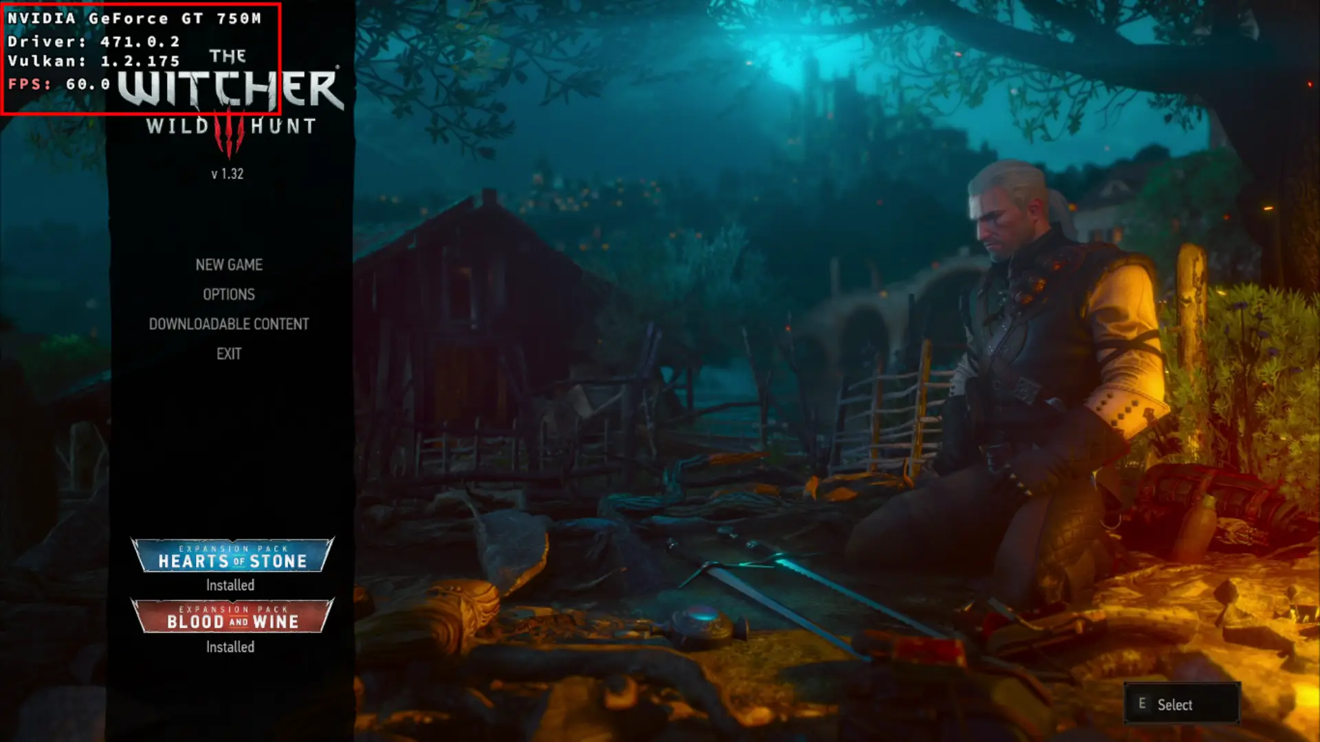 This screenshot shows The Witcher 3: Wild Hunt (v1.32) running successfully on a Kepler NVIDIA GeForce GT 750M (2GB) using DXVK 1.7.3 with Vulkan 1.2.175. The HUD shows 60 FPS, confirming that Vulkan is actively engaged. Wine’s default OpenGL translation can’t achieve this performance. Actual gameplay FPS typically ranges from 25-43 depending on the in-game area and scene complexity. If you have a more powerful GPU (which means newer Vulkan), you’ll see significantly higher frame rates. The 60 FPS shown here isn’t a hard limit for this game on Linux.